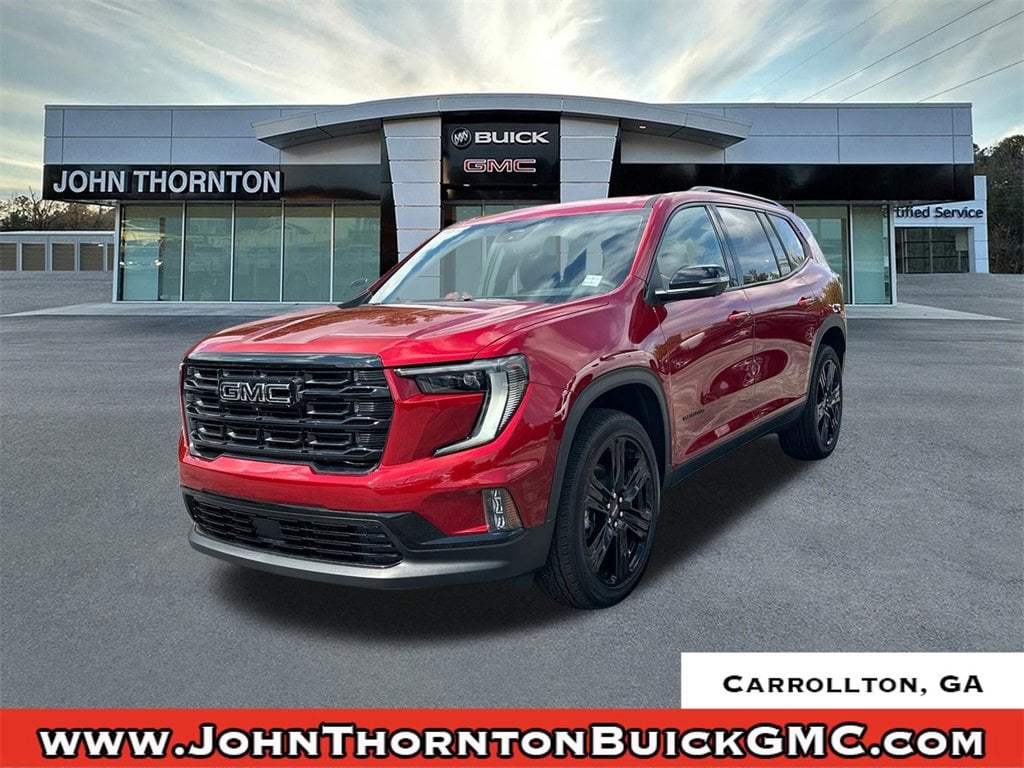 2026 GMC Acadia Elevation20/26 City/Highway MPGVolcanic Red Tintcoat 2026 GMC Acadia Elevation FWD 8-Speed Automatic 2.5L DOHCWe are your premier Carrollton, GA Cadillac dealership. John Thornton Cadillac Inc. Is family owned, and it is our goal to provide you with an excellent purchase and ownership experience. We also proudly serve Douglasville Cadillac customers. Whether you're searching for a new or used car near Douglasville or Bremen, researching financing options, or looking for a quick quote on a car, truck, or SUV, the friendly, yet professional staff at our Carrollton Cadillac dealership is ready to provide you with all the help you need. We are proud to serve Bremen Cadillac customers. We have served as your premier Cadillac dealer for the entire West Georgia area for over 45 years. Black Edition (Front & Rear Black GMC Emblems (LPO), Gloss Black Roof Rails, High Gloss Black Door Upper Molding, and Wheels: 22 x 8.5 Gloss Black Aluminum), Elevation Premium Package (3-Channel Programmable Universal Home Remote, 6-Way Power Front Passenger Seat Adjuster, 7-Passenger Seating (2-2-3 Seating Configuration), CoreTec Seat Trim, and Front Passenger Power Lumbar Seat Adjuster), Floor Liner Package (LPO) (1st & 2nd Row All-Weather Floor Liner (LPO), 3rd Row All-Weather Floor Liner (LPO), and Integrated Cargo Liner (LPO)), Luxury Package (8 Diagonal Head-Up Display, Heated Rear Outboard Seating Positions, Heated Wiper Park, and Laminated Acoustic Glass), Preferred Equipment Group 4SC, FWD, After Dark Cloth, 12 Speakers, 18 x 7.5 Aluminum Wheels, 2-Way Driver Power Lumbar Seat Adjuster, 3.49 Final Drive Axle Ratio, 3rd row seats: split-bench, 4-Way Manual Front Passenger Seat Adjuster, 4-Wheel Disc Brakes, 8-Passenger Seating (2-3-3 Seating Configuration), 8-Way Power Driver Seat Adjuster, ABS brakes, Air Conditioning, Alloy wheels, AM/FM radio: SiriusXM with 360L, Apple CarPlay/Android Auto, Auto High-beam Headlights, Automatic temperature control, Bodyside moldings, Bose Premium 12-Speaker System w/Sub-Woofer, Brake assist, Bumpers: body-color, Cloth Seat Trim, Compass, Delay-off headlights, Driver door bin, Driver vanity mirror, Dual front impact airbags, Dual front side impact airbags, Electronic Stability Control, Emergency communication system: OnStar Services capable, Exterior Parking Camera Rear, Four wheel independent suspension, Front anti-roll bar, Front Bucket Seats, Front Center Armrest, Front dual zone A/C, Front fog lights, Front reading lights, Fully automatic headlights, Heated door mirrors, Heated Driver & Front Passenger Seats, Heated front seats, Heated steering wheel, Illuminated entry, Leather steering wheel, Low tire pressure warning, Navigation System, Occupant sensing airbag, Outside temperature display, Overhead airbag, Overhead console, Panic alarm, Passenger door bin, Passenger vanity mirror, Performance Suspension, Power door mirrors, Power driver seat, Power Liftgate, Power steering, Power windows, Radio data system, Radio: 15 Premium GMC Infotainment System, Rear air conditioning, Rear anti-roll bar, Rear reading lights, Rear seat center armrest, Rear side impact airbag, Rear window defroster, Rear window wiper, Remote keyless entry, Security system, SiriusXM w/360L, Speed control, Speed-sensing steering, Split folding rear seat, Spoiler, Sport steering wheel, Steering wheel mounted audio controls, Tachometer, Telescoping steering wheel, Tilt steering wheel, Traction control, Trip computer, Turn signal indicator mirrors, Variably intermittent wipers, and Voltmeter.FWD, After Dark Cloth.