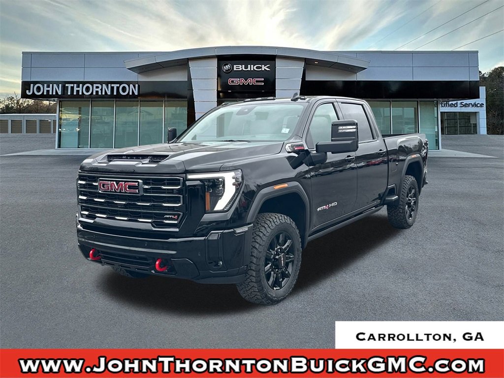 We are your premier Carrollton, GA Cadillac dealership. John Thornton Cadillac Inc. Is family owned, and it is our goal to provide you with an excellent purchase and ownership experience. We also proudly serve Douglasville Cadillac customers. Whether you're searching for a new or used car near Douglasville or Bremen, researching financing options, or looking for a quick quote on a car, truck, or SUV, the friendly, yet professional staff at our Carrollton Cadillac dealership is ready to provide you with all the help you need. We are proud to serve Bremen Cadillac customers. We have served as your premier Cadillac dealer for the entire West Georgia area for over 45 years. AT4 Preferred Package (LED Smoked Amber Roof Marker Lamps, Power Sliding Rear Window with Defogger, and Universal Home Remote), AT4 Premium Plus Package (Power Sunroof), Gooseneck/5th Wheel Prep Package, Hitch Package, Preferred Equipment Group 4SB (120-Volt Bed Mounted Power Outlet, 120-Volt Instrument Panel Power Outlet, 2 Charge-Only Rear USB Ports, 2 Charge/Data USB Ports Inside Center Console, 2 USB Ports, 2-Speed Active Transfer Case, Bed View Camera with Two Trailer Camera Provisions, Bose Premium 7-Speaker Sound System, Deep-Tinted Glass, Electric Rear-Window Defogger, Floor-Mounted Center Console, Front Premium Floor Liners with Removable Carpet Insert, Front Rain-Sensing Wipers, Gloss Black Header Grille and Grille Insert Bars, HD Surround Vision, Heated 2nd Row Outboard Seats, Heated Driver and Front Outboard Passenger Seats, Keyless Open and Start, LED Cargo Area Lighting, Manual Tilt-Wheel/Telescoping Steering Column, OnStar Services Capable, Power Front Passenger Windows with Express Up/Down, Push Button Start, Rear Cross Traffic Alert, Rear Premium Floor Liners with Removable Carpet Insert, Rear Wheelhouse Liners, Remote Vehicle Starter System, Safety Alert Seat, SiriusXM with 360L Trial Subscription, Spray-on Pickup Bedliner with GMC Logo, Steering Wheel Audio Controls, Trailer Cam Provisions and Trailer Viewing Software, Trailer Side Blind Zone Alert, Ultrasonic Front and Rear Park Assist, Unauthorized Entry Theft-Deterrent System, Ventilated Driver and Front Passenger Seats, Wireless Charging, and Wireless Phone Projection), Technology Package (Inside Rearview Auo-Dimming Rear Camera Mirror and Multicolor 15 Diagonal Head-Up Display), X31 Off-Road Package (Hill Descent Control and Off-Road Suspension), 10-Speed Automatic, 4WD, Jet Black With Kalahari Accents Leather, 10-Way Power Driver Seat Adjuster with Lumbar, 10-Way Power Passenger Seat Adjuster with Lumbar, 1st and 2nd Rows All-Weather Floor Liners, 220-Amp Alternator, 4-Wheel Disc Brakes, 7 Speakers, ABS brakes, Air Conditioning, Alloy wheels, AM/FM radio: SiriusXM with 360L, Apple CarPlay/Android Auto, Auto High-beam Headlights, Auto-dimming door mirrors, Auto-dimming Rear-View mirror, Automatic Emergency Braking, Automatic temperature control, Brake assist, Buckle to Drive, Bumpers: body-color, Compass, Delay-off headlights, Driver door bin, Driver Memory, Driver vanity mirror, Dual front impact airbags, Dual front side impact airbags, Electronic Stability Control, Emergency communication system: OnStar, Engine Block Heater, Exhaust Brake, Following Distance Indicator, Forward Collision Alert, Front anti-roll bar, Front Bucket Seats, Front Center Armrest, Front dual zone A/C, Front fog lights, Front License Plate Kit, Front Pedestrian Braking, Front reading lights, Front wheel independent suspension, Fully automatic headlights, Heated door mirrors, Heated front seats, Heated rear seats, Heated steering wheel, Heavy-Duty 80 Amp Battery, Hitch Guidance with Hitch View, Illuminated entry, in-Vehicle Trailering System App, IntelliBeam Automatic High Beam on/Off, Lane Departure Warning System, Low tire pre