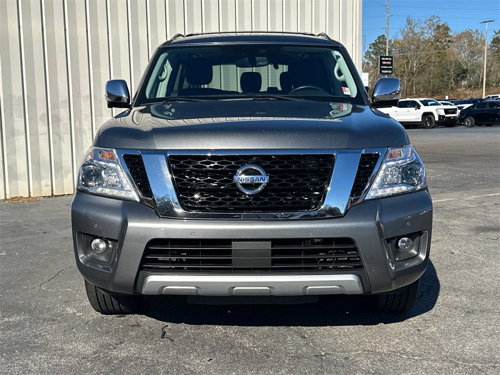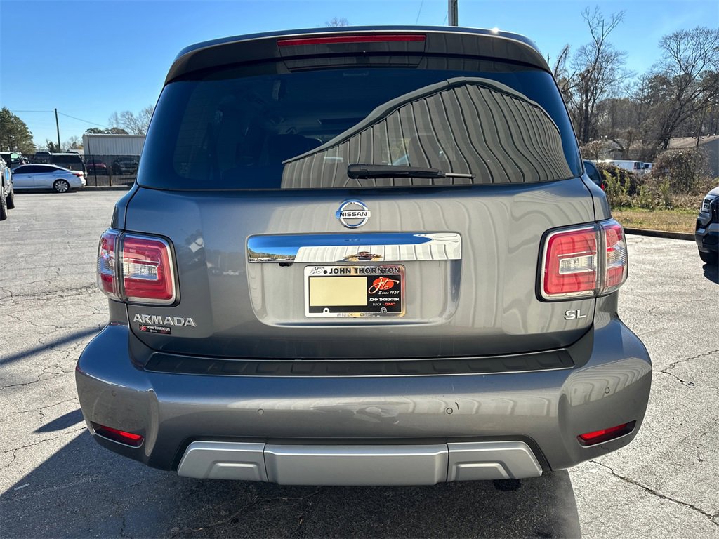 Thank you for considering this beautiful 2018 Nissan Armada SL finished in stunning Gun Metallic with Charcoal Leather.Odometer is 18523 miles below market average!Priced below KBB Fair Purchase Price!14/19 City/Highway MPGWe are your premier Carrollton, GA Cadillac dealership. John Thornton Cadillac Inc. Is family owned, and it is our goal to provide you with an excellent purchase and ownership experience. We also proudly serve Douglasville Cadillac customers. Whether you're searching for a new or used car near Douglasville or Bremen, researching financing options, or looking for a quick quote on a car, truck, or SUV, the friendly, yet professional staff at our Carrollton Cadillac dealership is ready to provide you with all the help you need. We are proud to serve Bremen Cadillac customers. We have served as your premier Cadillac dealer for the entire West Georgia area for over 45 years. Interior Lighting Package, Premium Package (Automatic Emergency Braking (AEB), Blind Spot Warning, Intelligent Back-Up Intervention (I-BI), Intelligent Cruise Control w/Full-Spd Range (ICC), Intelligent Distance Control (I-DC), Intelligent Forward Collision Warning (I-FCW), and Power Sliding Moonroof w/Front Tilt & Rear Slide), 13 Speakers, 2.937 Axle Ratio, 2nd & 3rd Row Carpeted Mats, 3rd row seats: split-bench, 4-Wheel Disc Brakes, ABS brakes, Activation Disclaimer, Air Conditioning, Alloy wheels, AM/FM radio: SiriusXM, Anti-whiplash front head restraints, Auto tilt-away steering wheel, Auto-dimming door mirrors, Auto-dimming Rear-View mirror, Auto-leveling suspension, Automatic temperature control, Brake assist, Bumpers: body-color, CD player, Delay-off headlights, Driver door bin, Driver vanity mirror, Dual front impact airbags, Dual front side impact airbags, Electronic Stability Control, Emergency communication system: NissanConnect Services, Four wheel independent suspension, Front anti-roll bar, Front Bucket Seats, Front Center Armrest, Front dual zone A/C, Front fog lights, Front reading lights, Fully automatic headlights, Garage door transmitter: HomeLink, Heated door mirrors, Heated Front Bucket Seats w/Driver Memory, Heated front seats, Illuminated entry, Leather Shift Knob, Leather-Appointed Seat Trim, Low tire pressure warning, Memory seat, Navigation System, Occupant sensing airbag, Outside temperature display, Overhead airbag, Overhead console, Panic alarm, Passenger door bin, Passenger vanity mirror, Power door mirrors, Power driver seat, Power Liftgate, Power passenger seat, Power steering, Power windows, Radio data system, Radio: Bose AM/FM/SXM/CD/MP3/HD Radio, Rain sensing wipers, Rear air conditioning, Rear anti-roll bar, Rear reading lights, Rear seat center armrest, Rear window defroster, Rear window wiper, Reclining 3rd row seat, Remote keyless entry, Roof rack: rails only, Roof Rail Cross Bars, Security system, Speed control, Speed-sensing steering, Speed-Sensitive Wipers, Split folding rear seat, Spoiler, Steering wheel memory, Steering wheel mounted audio controls, Tachometer, Telescoping steering wheel, Tilt steering wheel, Traction control, Trip computer, Turn signal indicator mirrors, Variably intermittent wipers, Voltmeter, and Wheels: 20 Machined Finish Painted Alloy.PLEASE CALL 770-832-9602 TODAY!!!.